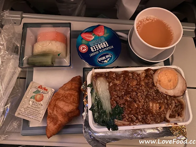 經濟艙提供兩餐,第一餐為起飛後約一小時送上,一般是中式與西式兩種選擇。這次我選了義大利肉醬筆管麵,搭配軟麵包、沙拉與水果,口味中規中矩但熱度維持得不錯,餐具是金屬製的,增添些許質感。第二餐則是接近抵達時的早餐盒,有炒蛋、香腸與烤馬鈴薯,整體味道OK,不過早餐的水果比較少。